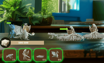 Concept: Two children battle using origami units. Players fold origami units to spawn them in a battle.